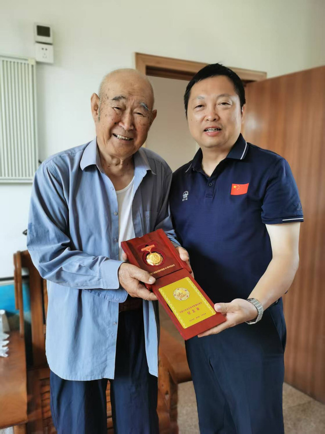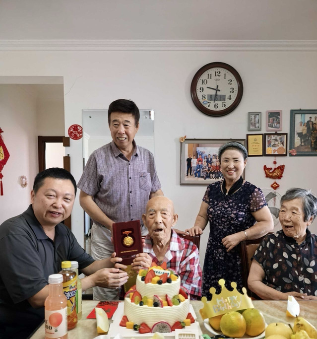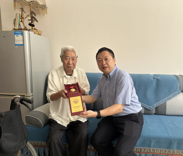在纪念中国人民抗日战争暨世界反法西斯战争胜利80周年之际,学校党委组织部副部长兼离退休工作处处长、老科协副会长苏功臣带领工作人员,先后分别前往刘文志、周树今、肖凌云3位抗战老战士家中走访慰问,代表学校向他们致以崇高敬意和亲切关怀,并郑重颁授由中共中央、国务院、中央军委联合颁发的“中国人民抗日战争胜利80周年纪念章”。